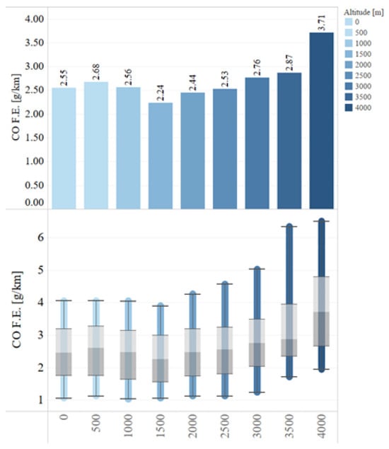 Figure 14 illustrates the altimetric impact on the emission indices of carbon dioxide (CO2) derived from the operation of internal combustion engines. An inverse variation between altitude and CO2 concentration was observed, while the other emissions such as carbon monoxide (CO) showed an increase. It is important to highlight that CO2 concentration serves as a marker of engine efficiency, largely determined by a higher volumetric efficiency. However, as combustion becomes less efficient, a decrease in the presence of this compound is evidenced.
