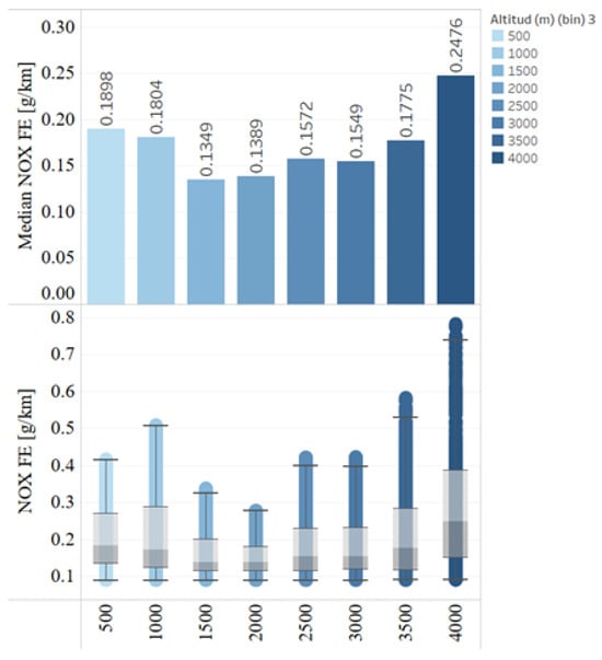 The research showed a gradual decrease in carbon dioxide (CO2) emissions with increasing altitude, as observed in Figure 14. This behavior suggested a reduction in the efficiency of the combustion process at higher altitudes, marking a decrease in CO2 emissions from 263.03 g/km to 250 g/km when ascending from 500 m to 4000 m altitude. Concurrently, Figure 15 and Figure 16 show an increase in carbon monoxide (CO) and nitrogen oxides (NOx) emissions, respectively. CO emissions rose from 2.55 g/km to 3.71 g/km, while NOx emissions increased from 0.1398 g/km to 0.2476 g/km over the same altitude range. These trends indicated that, although the combustion efficiency decreased, which might have been expected to reduce all emissions, the increase in CO and NOx emissions highlighted an imbalance in fuel combustion, likely due to the reduced availability of oxygen at higher altitudes. These findings are crucial for understanding how altitude affects vehicle pollutant emissions and point to the need for adjusting emission-control technologies in high-altitude environments.
