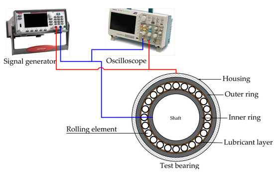 The electrical part of the set-up comprises a signal generator, a dual-channel digital oscilloscope, a current probe, and electric wires. The signal generator is used to supply the voltage via the electric wires to induce a potential difference across the bearing. One wire terminal is connected to the bearing inner ring while the other terminal contacts the outer ring of the bearing, completing the circuit back to the generator. A dual-channel oscilloscope is utilized to measure and log both the applied voltage and current. The first channel was designated for current measurements, while the second channel recorded the voltage. The (RT-ZCO3) current probe is used to measure the current across the bearing. The electrical layout of the test set-up is shown in Figure 3. Table 1 details the specifications of the components of the experimental test set-up while the specifications of the test bearing, which is a single-row deep-groove ball bearing (type 6006-2Z-C3), are detailed in Table 2. This specific bearing model was selected to emulate the type of bearings used in EV motors that are subjected to parasitic currents [52].