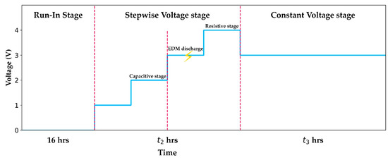 During the final stage of the experiment, the applied voltage is adjusted back to the highest recorded breakdown voltage, and the experiment is allowed to run continuously for an additional 6 h, marking the end of the experiment. Figure 4 shows the schematic illustration depicting all three stages of the experiment. The total time taken per experiment is approximately 24 h.