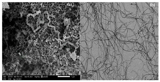 Microstructure of the MWCNT as observed under (a) SEM and (b) TEM.