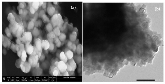 Figure 6a presents the SEM micrograph of Al2O3 nanoparticles, clearly indicating their approximate spherical shapes with an average particle diameter in the range of 25–30 nm. Additionally, the agglomerated nature of these particles is evident in both the SEM and TEM micrographs. This shows a tendency of the nanoparticles to cluster together, which is seen consistently across both imaging techniques.