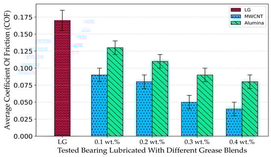The result for friction testing using a pin-on-disk tribo-tester on each grease blend showing the average coefficient of friction (COF) is presented in Figure 7. The LG sample exhibited the highest COF compared to grease blends containing nano-additives. With increasing concentrations of the nano-additives, a gradual decrease in the COF is observed. When compared to the LG, the nano-grease with MWCNT exhibited a reduction in the average COF values equivalent to 47.06%, 52.94%, 70.58%, and 76.47% for concentrations of 0.1 wt.%, 0.2 wt.%, 0.3 wt.%, and 0.1 wt.%. Similarly, for Al2O3 grease blends, the recorded percentage reductions in the average COF were 23.53%, 35.29%, 47.60%, and 52.94% for the same concentrations as the MWCNT. These COF values agree with those reported in the literature [59].