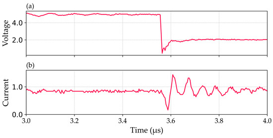 For the bearing lubricated with LG and operating at low-voltage amplitudes, no electric discharges were observed, which indicates a capacitive current state in the bearing electric circuit across the lubricant. Once the bearing voltage value exceeded 1.2 V, small spikes in the bearing current started to appear over the recorded time, which indicates reaching the dielectric strength of the bearing lubricant and causing the behavior of the lubricant to change into electric discharge machining (EDM) current. The severity of the EDM current continued to increase as the voltage amplitude gradually increased. At voltage amplitudes exceeding 3.5 V, significant surges in both voltage and current magnitudes were noted, accompanied by clear and more persistent discharge pulses. Figure 8 illustrates a portion of the voltage and current signals recorded for the bearing lubricated with LG subjected to a voltage of 4.5 V. Specifically, Figure 8a depicts the bearing voltage signal during a discharge event, while Figure 8b presents the corresponding current signal. Figure 8 illustrates the capacitive behavior of the lubricant, where the input voltage remains relatively constant until it suddenly drops to a significantly lower voltage level [60,61]. Discharges were observed to persistently occur until the voltage levels reached 4.5 V, beyond which no further EDM discharges were detected, and both the current and voltage measurements exhibited extreme fluctuations. It was confirmed that the current state at this stage is the resistive state.