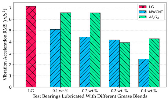 Figure 10 presents the vibration root mean square (RMS) acceleration amplitudes for tested bearing lubricated with the nano-grease blends. Notably, all tested bearings exhibited high-vibration RMS acceleration values, which can be ascribed to the surface degradations of bearing raceways induced by arc discharges.