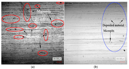 D laser microscope images for the outer raceway surface of (a) a bearing lubricated with LG, and (b) a bearing lubricated with 0.1 wt.% of Al2O3.