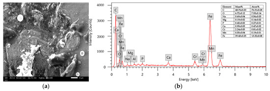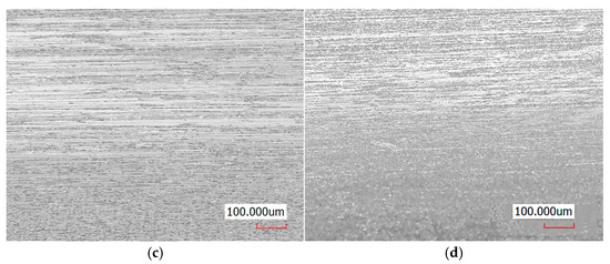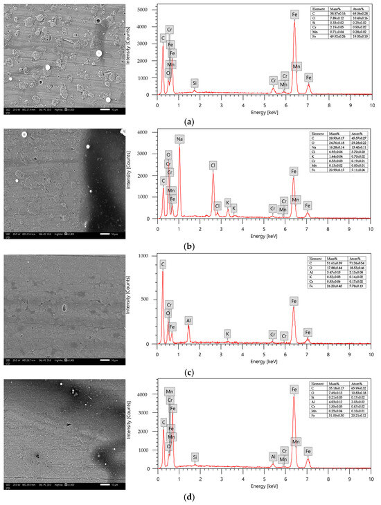Similarly, the micrographs and EDX spectra for bearings lubricated with grease blended with Al2O3 are presented in Figure 17a–d. The SEM images show the presence of micropits and frosting bands of the raceway in all test cases [76]. As the concentration of Al2O3 increases, a progressive decrease in the degree of pitting is observed, which indicates that Al2O3 offers some protection against EDM discharges. Because of their minute sizes and high specific surface area, Al2O3 nanoparticles have been shown to have a mending effect on the bearing raceway surface by restoring worn-out portions [59]. An analysis of the EDX spectra confirms the presence of aluminum on the bearing surface at concentrations of 0.3 wt.% and 0.4 wt.%, while no aluminum was detected at the lower concentrations of 0.1 wt.% and 0.2 wt.%. This finding suggests that there is an optimal concentration at which Al2O3 becomes effective in mitigating EDM discharges.