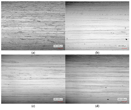 Laser microscope image of bearings lubricated with (a) 0.1 wt.% of Al2O3, (b) 0.2 wt.% of Al2O3, (c) 0.3 wt.% of Al2O3, and (d) 0.4 wt.% of Al2O3.
