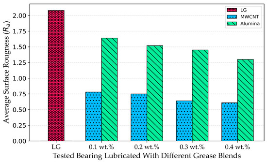 For the grease containing MWCNT, the average surface roughness values were measured at 0.78 µm, 0.75 µm, 0.64 µm, and 0.61 µm for concentrations of 0.1 wt.%, 0.2 wt.%, 0.3 wt.%, and 0.4 wt.%, respectively. These values represent percentage reductions in the surface wear of the bearing raceway of up to 62.50%, 63.94%, 69.23%, and 70.67%. In comparison, for the bearings lubricated with grease containing Al2O3, the average surface roughness values were measured at 1.64 µm, 1.52 µm, 1.45 µm, and 1.30 µm for concentrations of 0.1 wt.%, 0.2 wt.%, 0.3 wt.%, and 0.4 wt.%, respectively. These measurements correspond to reductions of 21.2%, 26.9%, 30.3%, and 37.5% when compared to the surface roughness values recorded for LG. Figure 14 illustrates the surface roughness measurements for all test cases.
