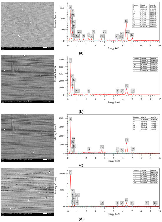 SEM micrographs and EDX spectra for bearings lubricated with MWCNT at concentrations of (a) 0.1 wt.%, (b) 0.2 wt.%, (c) 0.3 wt.%, and (d) 0.4 wt.%.