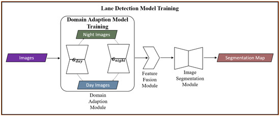 This section explains how to combine domain adaptation, feature fusion, and image segmentation modules for lane detection training. As shown in Figure 3, we divided the training images into nighttime and daytime images. Nighttime images were input into the CycleGAN generator that turned nighttime into daytime, namely , and daytime images were input into the CycleGAN generator that turned daytime into nighttime, namely . The multi-scale feature maps output by and were then input to the respective feature fusion modules, namely and . The and outputs via or were then input to the lane detection module at the same time. The lane detection module would eventually output the instance segmentation maps and output by the decoder at the same time, as well as the confidence and of the lane existence. Equation (12) is the total loss of the lane detection model.
