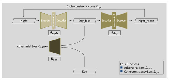 where tries to convert nighttime images into day images, and tries to convert daytime images into nighttime images. Our overall objective function is shown in Equation (3).