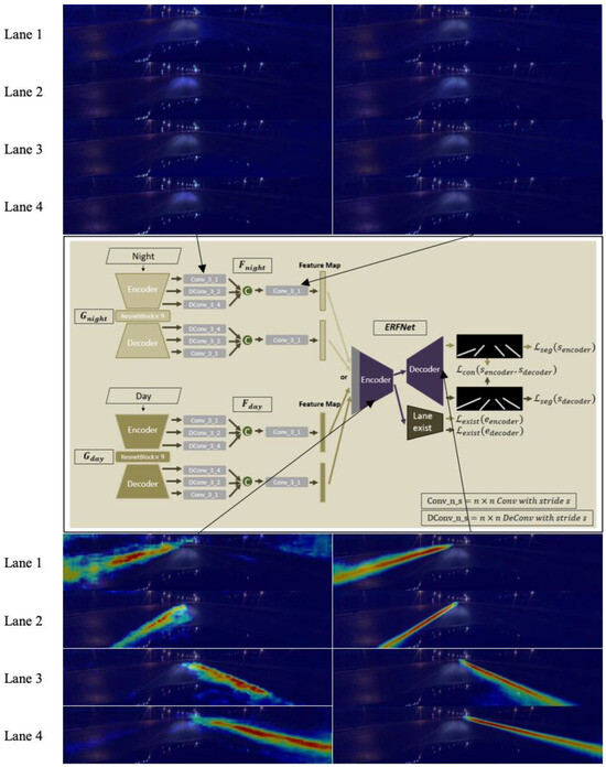In the previous chapter, we obtained the feature map by combining the encoder and decoder. Next, we used the image segmentation module to input feature maps representing nighttime and daytime to detect the position and shape of the lane. The image segmentation module could choose advanced image segmentation network models such as ERFNet [35], DLA [36], and DDRNet [37]. An image segmentation model is a deep learning technique that aims to segment an input image into different regions or groups of pixels and assign a corresponding label to each region. This technique enables the model to identify and distinguish between different objects, structures, or features in the imagery, enabling precise area localization and classification. Image segmentation models usually use deep learning architectures such as CNN to learn to extract features from a huge amount of labeled data, and then achieve accurate segmentation and classification tasks for new images. In lane detection, the image segmentation model can help us effectively identify different lane lines and backgrounds, thus providing key information support for lane detection methods. We used ERFNet as an example to illustrate the changes in our method and model. ERFNet is a deep learning model for semantic segmentation tasks. The core idea of ERFNet is to use factorized convolutions and residual connections to achieve efficient and accurate models. Factorized convolution splits a large convolution operation into multiple smaller convolution operations to reduce the computational load of the model. The non-bottleneck-1D that was proposed in the encoder section is a module that combines factorized convolution and residual connection and expands the field of view of the convolution layer by adding dilated convolution.
