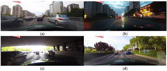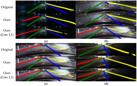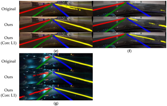 In the CULane test dataset, in addition to the night scene, there were other challenging scenes, termed Crowded, Dazzle, Shadow, and Arrow. Figure 5 shows examples of these scenes. Crowded represents a scene with many vehicles. Because too many vehicles will increase the probability of lane lines being obscured, it will increase the difficulty of detecting lanes. Dazzle refers to scenes with glare, which usually appear in the early morning or evening. Excessive strong light will not only reduce the quality of the entire image but also blur some lane lines, which will affect lane detection performance. Shadow refers to lane lines under bridges or other shadows. Shadows will reduce the contrast of the image, and the edges of lane lines may become less clear. Arrow refers to objects similar to lane lines such as pointing lines in the lane, which may cause the model to misjudge. We also used the ERFNet model to validate the efficacy of our approach in enhancing the model’s recognition capability in these challenging scenarios. The experiments in Table 8 show that our method effectively improves the recognition ability of the model in these scenes, and the F1 score increased by about 0.1 to 1.2%. After adding consistent loss, the F1 score increased by 0.5 to 3.5% in total.