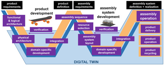 As mentioned before, the two cycles are connected with the assembly sequence, which is one of the main sources of information for assembly system development, but cannot be generated without knowledge concerning the assembly system concept. It is also important to note that in this representation, the development process progresses to the recycling stage in order to be able to represent the complete scope of a digital twin (DT) (see Section 5).