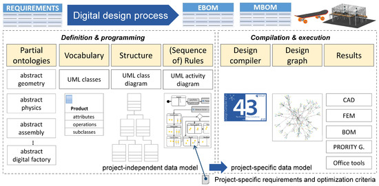 In the proposed framework, the culmination point for product modelling and the compilation of GBDLs is the so-called Design Cockpit 43® software environment [40], which is based on the fundamental research activities of Rudolph [41] and many of his co-workers (see [42,43] for two of the most recent contributions). The Design Cockpit 43® software was developed, maintained, and further extended by IILS mbH (Trochtelfingen, Germany) [40]. This software environment enables the storage of design information in the form of ontologies, the coding of product and assembly system information as vocabulary, as well the transformation of the coded knowledge into a unified central model—the design graph. The digital design process with GBDLs is shown in Figure 3 (adapted from [41,44]).