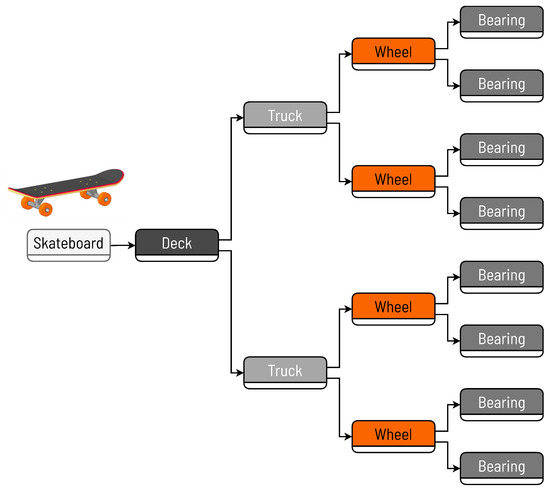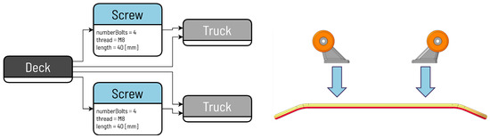 The digital design process shown in Figure 3 has already been described in detail in earlier publications [44,51]. It is important to note that the general procedure is applicable to all M2M and M2T transformations in integrated product and assembly system development. In the following, the architecture design and the underlying methodology, which is illustrated in Figure 2, will be discussed using the product model of a skateboard (see Figure 4).