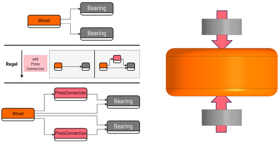 This assembly is represented by “PressConnection” (Figure 6). The assembly operation modelled with this rule is implicitly visible on the right side of Figure 4; slightly further on the left in Figure 4 is the assembly of the wheels on an axle of a truck (Figure 6).