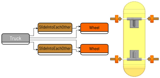 This assembly is represented by “SlideIntoEachOther” (Figure 6). The next assembly step concerns the connection of each truck with the deck by means of screwing. This is presented in Figure 7.