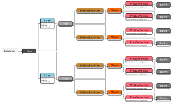 This assembly is represented by “Screw” (Figure 7). Representing these assembly operations, the product model of the skateboard shown in Figure 4 is supplemented with joining information; the result is an enriched product model (see also Figure 2). This enriched product model is shown in Figure 8.