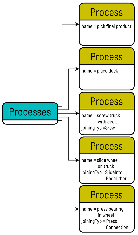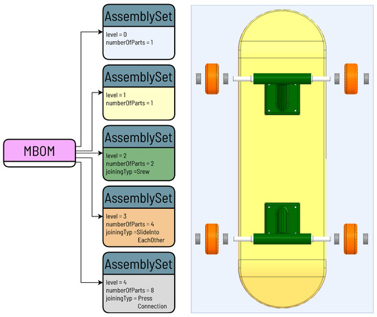 In order to determine the number of similar assemblies, a width-based search is carried out in which the model is first simplified and then grouped. The width-based search performed on the existing graph, which functions as an enriched product model, is carried out depending on the requirements for fully and partially similar cases. A fully similar case would be defined by identical components (in terms of geometric characteristics and properties) with the same joining technique. Partially similar cases would be characterised by components that are similar in many, but not all, properties and whose joining techniques also have a large number of identical properties. As a result of this search, five assembly sets (“AssemblySet”—a collection of parts that require similar assembly operations) are identified, as shown in Figure 9.