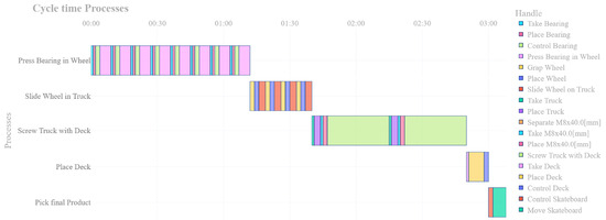 The formal description of the main and sub-processes delineates the full range of handling and joining techniques. These describe the minimum steps that must be carried out in order for the assembly step to be completed successfully. Based on the aforementioned information, an initial estimation of the cycle time can be made. Subsequently, the cycle time is estimated for each individual handling step and for each joining technique. In this context, two distinct approaches are employed. In this approach, tabular values derived from the “Methods-Time-Measurement” [56] method are employed. The present analysis focuses on the temporal recording of handling steps. The analysis focuses on handling steps employed in manual assembly, with some values applicable to automated assembly. The determined value is multiplied by a correction factor, which serves as an adjustment variable. This factor is adjusted iteratively by comparing the tabular value with the subsequent actual value from the virtual commissioning and adjusting it accordingly. For all other handling steps not included in the table, a simplified approach is used in the calculation.
