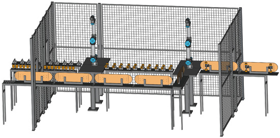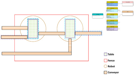 In this paper, the term “production planning” is used to describe the steps following the assembly planning, i.e., planning the concrete transport of parts in the assembly system, generating the 2D assembly system layout, generating the geometry of the assembly system with all non-human resources, and generating the movement path of resources (e.g., robot code). In the given project, the descriptions of the assembly system could be generated by taking into account the cycle time and the requirements. These describe the processes that are carried out in a cell, as well as the resources required for this, such as robots, holding devices, and conveyor belts. The above descriptions enable the derivation of a 2D layout, which is shown in Figure 13.