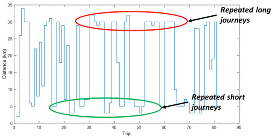 However, one practical limitation of these approaches is that drivers do not always connect to navigation services for routine repeated journeys. Such journeys are known to represent the majority of journeys made by the general public that are linked with daily routines such as commuting to work or to school. In terms of mileage or duration routine, journeys could be either short, long, or a mixture of both, as illustrated by the sample of real-world journey data for one vehicle shown in Figure 1. If navigation data are not available for routine journeys, which accounts the vast majority of vehicle usage for some users, the PEO strategy cannot be employed, and the base EMS is used instead. This not only results in suboptimal energy usage, but also durability concerns from frequent engine starts, in particular in conjunction with repeated short journeys.