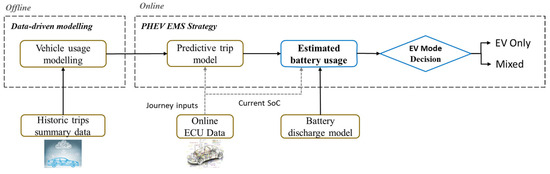The proposed intelligent PHEV EMS, shown in Figure 3, requires a predictive trip model for the current/upcoming journey (at the start of the journey) to estimate the energy required for completing the trip. The approach is predicated on the assumption that many users undertake routine vehicle usage patterns (commuting to work, school drop-off, also, completed without the use of navigation for route planning) with relatively short-distance journeys that could potentially be completed in the EV mode, depending on the battery SOC.