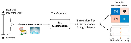 Figure 3 illustrates the process of ML modelling implemented. The ML modelling was carried out within the MATLAB (2021a, 9.10) Classification Learner [44] app. The training of the model is based on the data available on historic journeys for each vehicle, using only the basic features of the journey data (start time, day of the week and vehicle park time, defined as the time interval from the end of the previous trip), with the labelled trip distance (obtained from the binary class transformation in Equation (1)) as the prediction variable of interest. The choice to restrict the predictor features to the basic journey information was based on the judgement that the PHEV EMS will require a prediction immediately after the key-on event for the current/upcoming journey, at which point only the calendar trip parameters will be available.