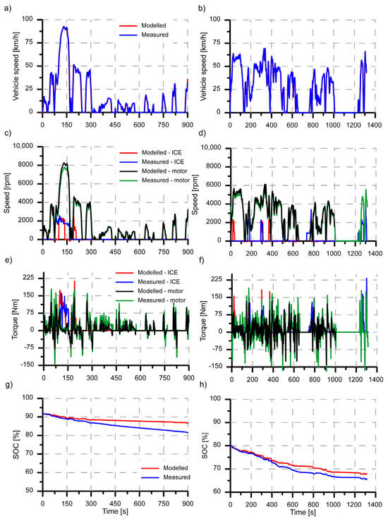 Autonomie PHEV model validation—comparison between modelled results and existing data in two real-world driving validation tests: vehicle speed (a,b); ICE and e-motor speed (c,d); ICE and e-motor torque (e,f); and SOC (g,h).