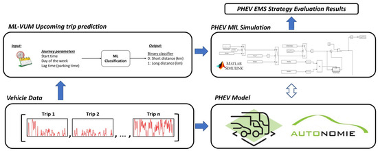 The challenges addressed in this study relate to three aspects: (i) the selection of features and ML algorithms that can be employed to predict the upcoming journey, with sufficient accuracy and robustness to be used for the proposed PHEV EMS; (ii) the development and validation of a PHEV simulation model, that can be employed for the model-in-the-loop (MIL) experiments; and (iii) setting up and conducting the MIL experiments to evaluate the performance of the proposed PHEV EMS comparatively against the standard PHEV EMS, with drive-cycle data reflecting the real-world usage of the vehicle.
