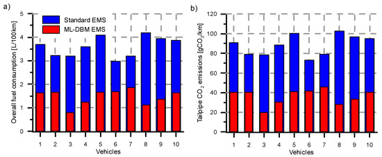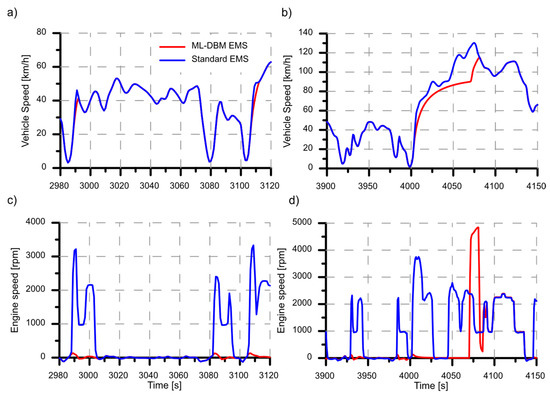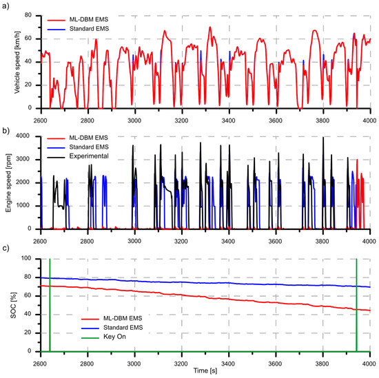 In order to illustrate the impact of ML-VUM EMSs on the powertrain operation, Figure 7 includes the comparison of vehicle speed profile, engine operation, and SOC between the reference case (standard PHEV EMSs) and ML-VUM EMSs for one randomly selected journey of vehicle 3. The cycle is defined by the key-on events, shown by green lines in plot (c). In this specific case, at the key-on event, the proposed PHEV EMS controller allows the vehicle to run purely in EV mode, as the energy stored in the battery is sufficient to propel the vehicle with only the e-motor. As a result, the ICE is not switched on during the journey, as Figure 7b reveals. By contrast, under the standard EMS conditions, the ICE does power the vehicle during rapid accelerations. The experimental ICE speed is also included in the plot, confirming the good reproduction of the real vehicle energy management system.