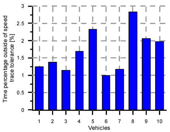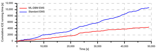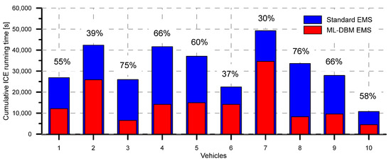 The quantification of the cumulative time with the ICE on duty was performed over the whole dataset of each vehicle. This is shown in Figure 8, which includes the cumulative time with the ICE switched on for both the reference EMSs and ML-VUM EMSs over the whole driving time simulation representing 12 months of driving.