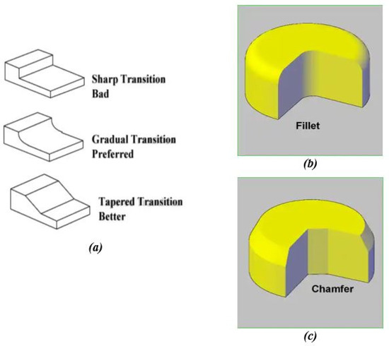 Illustrations of design simplicity (a) Using DfAM transitions should be tapered rather than sharp; (b) filets should have rounded corners for load bearing; and (c) chamfers should have slanted edges facilitating assembly.