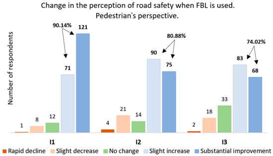 Also, there was a group of people who still had a neutral attitude towards FBLs. We assumed that pedestrians need time to adapt to the new signal (confusion due to new light signal in general) in order to develop communication with minimal misunderstandings. However, when reporting their own change in opinion, the majority of participants (81.8%) stated that safety perceived at crossing points improved over the duration of the field research study as a result of FBL presence. Only a small number of participants (8.7%) reported a negative shift. However, we have to agree with some of them who said that the driver may only use their brakes to reduce the speed of the vehicle without intending to stop completely (but the FBL is activated). However, an essential aspect of this pilot test was the easy installation of FBLs for practically any type of vehicle. For this reason, FBL activation was linked with the rear brake lights. In the future, there is a simple solution to mitigate this problem by calibrating a specific pressure point on the pedal when the FBL activates. Therefore, all results described in this study indicate a high level of acceptance of the FBL idea.