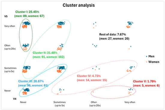 While answers to V2 were expressed on the Likert scale, V6 was an open-ended question. Thus, based on the participants’ responses, four clusters were created: never, rarely (1–2 times), occasionally (approximately 1 time per week), and often (more than 1 time per week).