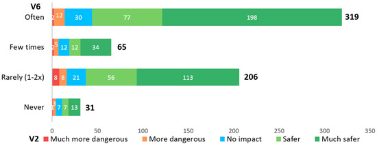 The subjective perception of safety prior to experiences with FLBs was analysed using question V1. The results obtained from V2 reflected the respondents’ attitudes towards FBLs. V1 was answered on a Likert scale (1—often, 5—never), and, to V2, respondents also had to choose one of five options (1—much more dangerous, 5—much safer).