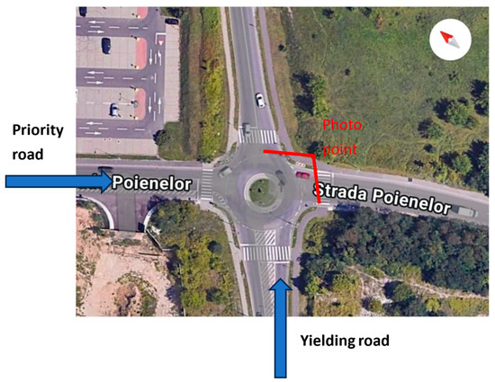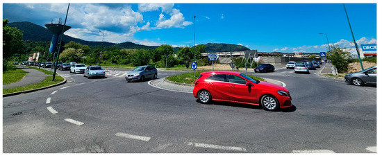 Figure 1. This street links the residential district to the city and is where the heaviest traffic takes place. According to Romanian traffic rules, vehicles approaching the roundabout from the right have the right of way. This means that drivers must yield to any vehicles already circulating within the roundabout before entering. This prioritization promotes efficient traffic flow while minimizing the risk of accidents. To enhance clarity, all four streets that lead into the roundabout are clearly marked with “give way” traffic signs.