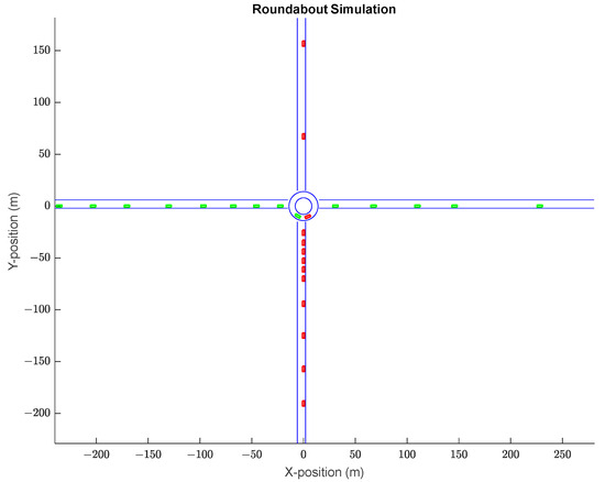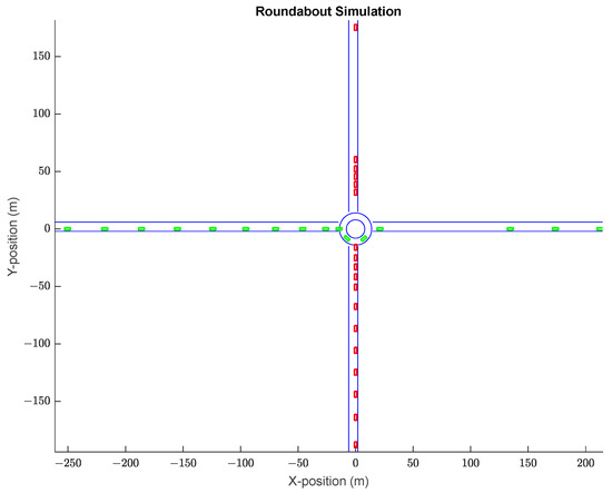 In the simulated scenarios, we considered that vehicles enter the roundabout and proceed straight from the two roads, priority and yielding. While this scenario may not reflect real-world conditions, it represents the most plausible situation during peak traffic periods. Both roads are one-lane roads positioned at 90-degree angles to each other, without the possibility of overtaking.