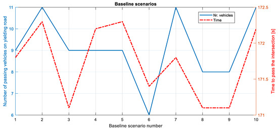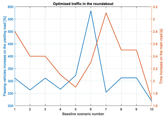 Figure 8). Among the ten baseline scenarios, 80% demonstrated an increase in traffic volume ranging from 260% to 310%. The best-performing scenario, scenario number 6, achieved a remarkable 570% increase in traffic volume, while the worst result came from scenario number 10, which saw an increase of 220%. In contrast, the traffic on the main road experienced only a slight delay as all 55 vehicles passed through the intersection, with an average increase of approximately 2.4 s. Seven scenarios recorded delays between 2.3 and 2.8 s; only two scenarios (5 and 10) had delays below 2 seconds, while one scenario (7) exceeded 3 seconds. These results indicate that the precomputed average values obtained from the optimization process have a significant impact on traffic optimization.