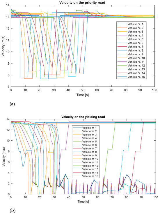 Figure 5b, on the yielding road, the first vehicle passes over without stopping, the second vehicle has to stop for about 3 s, and all subsequent vehicles must wait for over 10 s. During the simulated 100 s, only seven vehicles are able to pass over the roundabout, resulting in a queue where the remaining vehicles experience stop-and-go behavior.