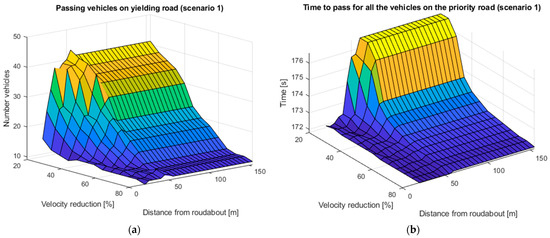 Figure 7a) and the total duration of the simulation, ensuring all 55 vehicles passed over the intersection (