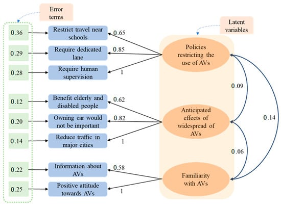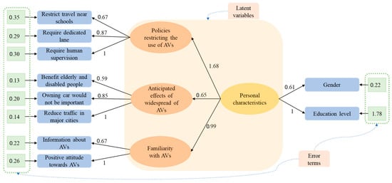 The SEM (Model 2) to identify the effect of users’ personal characteristics on their familiarity with AVs, their perception of policies restricting AVs, and the influence of widespread AVs is shown in Figure 2.