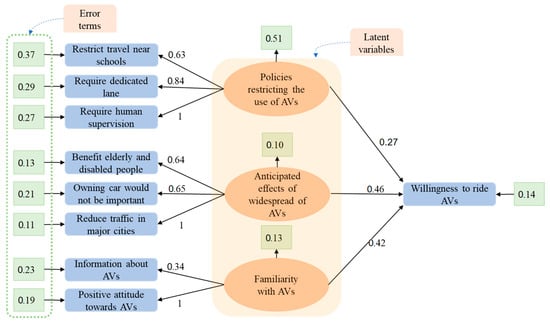 The SEM (Model 3) to identify the effect of each latent variable on the willingness to ride AVs is shown in Figure 3.