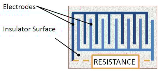The sensor used in this paper is based on the proven, well-known resistive technology. Resistive soot sensors have emerged as a promising technology for monitoring soot accumulation in diesel particulate filters (DPFs). Currently, they represent the conventional solution for detecting particulate filter failures. These sensors operate by measuring changes in electrical resistance caused by the deposition of soot particles on a sensing element. The change in resistance is directly correlated to the amount of soot deposited. Soot particles are trapped on a ceramic surface positioned within two interdigitated electrodes (see Figure 1). The sensing surface, which is exposed to the exhaust flow, is connected to a DC voltage. The sensing principle exploits the electrical conductivity of soot particles to detect their presence and quantify their accumulation.