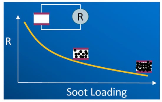 During operation, soot particles emitted in the exhaust line accumulate on the sensor surface and form conductive pathways between the electrodes. Initially, the sensor has a high resistance due to the ceramic material. As soot particles accumulate and create the first conductive path, the resistance begins to decrease, a phenomenon known as percolation. This decreasing resistance continues as more soot particles are trapped and additional conductive paths are established. This decreasing phenomenon persists as additional soot particles accumulate, creating further conductive pathways between the electrodes. Figure 2 illustrates the resistive sensor operating principle.