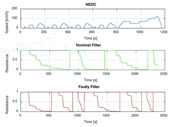 This study focuses on European Union emissions regulations that mandate the detection of DPF failure before soot emissions exceed the OBD limit of 12 mg/km, using the NEDC (New European Driving Cycle) [26,40]. The diagnostic assessment of faulty DPFs, where soot emissions exceed the OBD limit, must be conducted during certification using a maximum of three NEDC cycles. Additionally, diagnostics must be performed under real-world conditions at a minimum frequency as specified by the In-Use Performance Ratio (IUPR) standard. Figure 3 shows the NEDC cycle with samples of soot sensor responses for both healthy and faulty filters on a succession of two driving cycles.