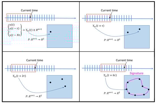 The subsequent points are obtained by applying the projection to vectors in a moving data window, thereby defining the signature in the 2D space at current time t: