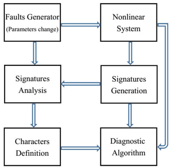 This section introduces the fundamental concept of the signature method and the corresponding diagnostic structure. It reviews the essential mathematical background required for generating signatures and outlines the procedure for character (feature) extraction. The signature method provides a computationally efficient framework for estimating and diagnosing dynamic systems, especially nonlinear systems where traditional observer-based approaches are challenging. By projecting output progressions onto a 2D plane within a moving window, the method highlights relevant features that are difficult to identify using model-based techniques. This approach is robust to uncertainties and variations in operating conditions while allowing for customization to enhance sensitivity to specific malfunctions. The signature method addresses dynamic nonlinear systems described by the following structure: